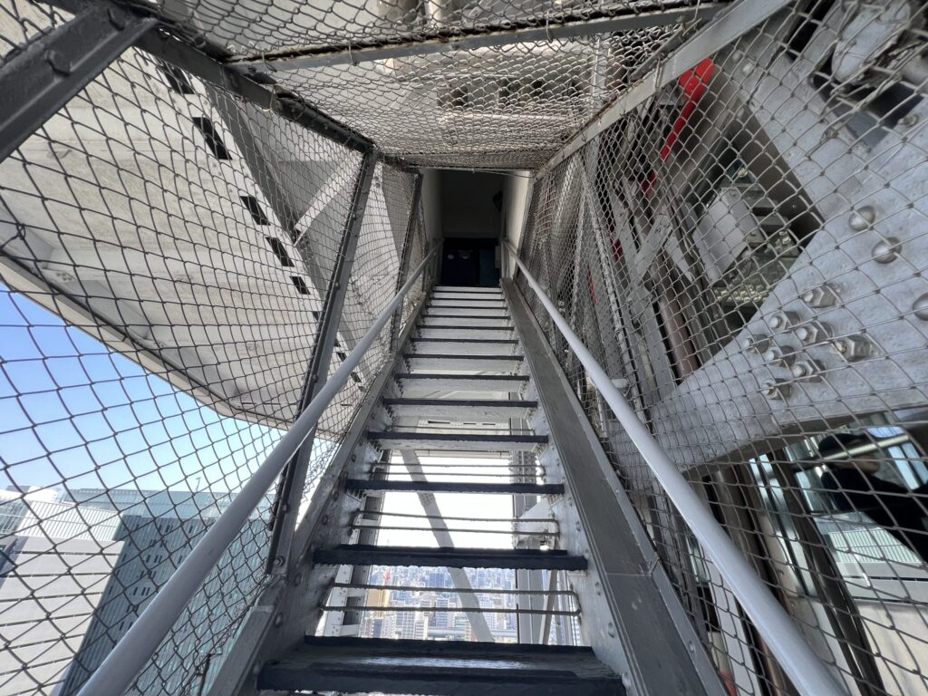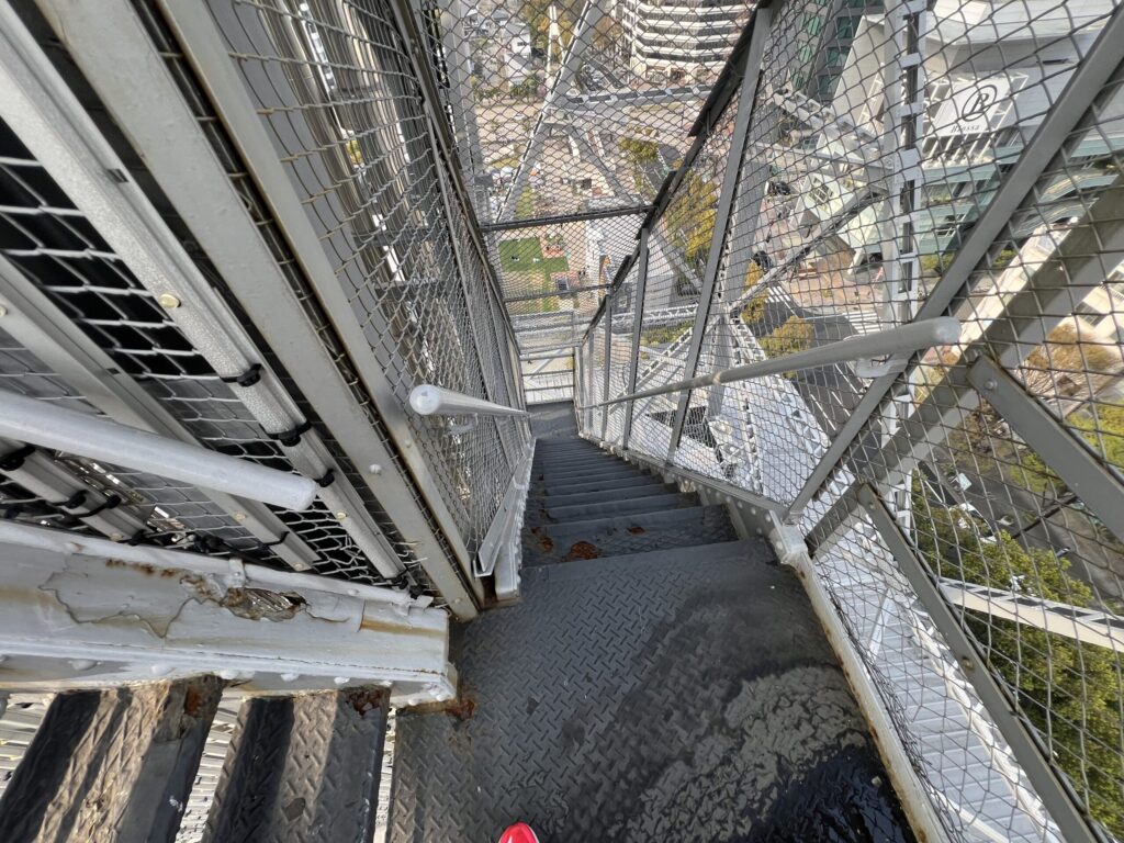 ミライタワーは、前半の螺旋階段、中盤のトラバース(横移動)と下り階段、後半の急勾配という、大きく分けて3つセクションに分かれます。各セクションとも一般的な非常階段とは異なり、クセ・クセ・大クセ!攻略難易度は世界屈指と言っても過言ではありません。